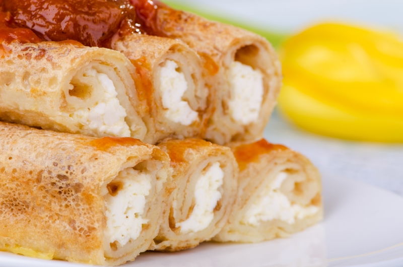 Teraz czas na twarożkowy farsz. Masę twarogową należy rozsmarować na usmażonych naleśnikach i każdy z osobna zwijać w rulonik.