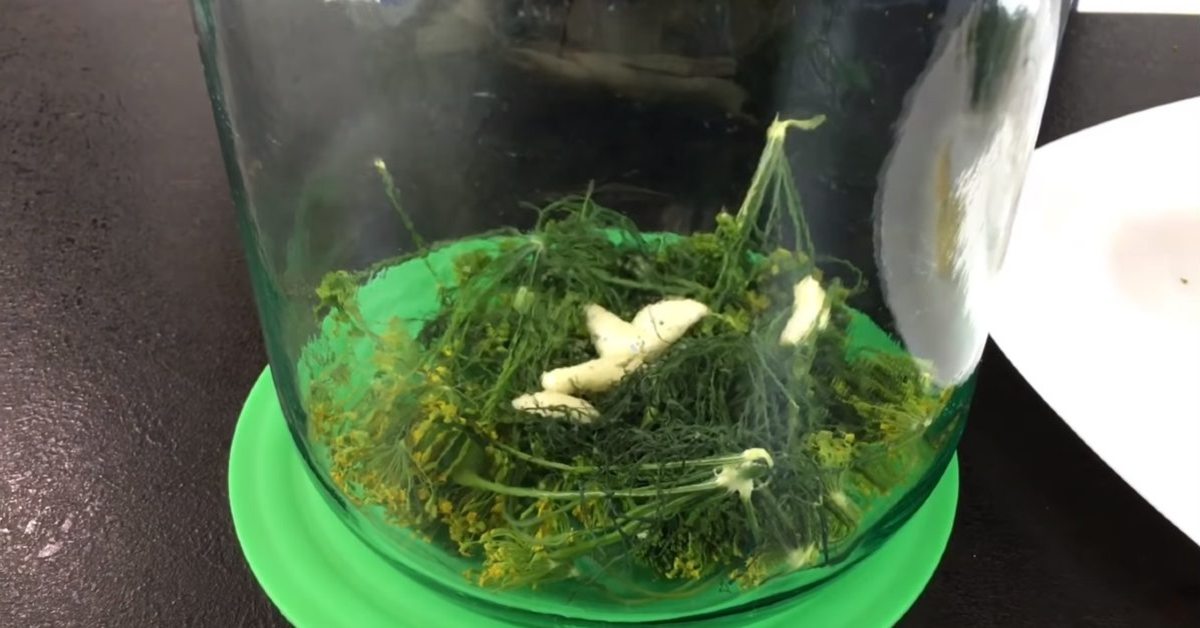 Następnie dodaj łodygi kopru (dwie zostaw na później). Kolejno bierz ogórki, odcinaj oba końce i wsadzaj ciasno do słoika. W ten sposób warzywo szybciej wchłonie aromaty. Na wierzch wsadź resztę kopru.