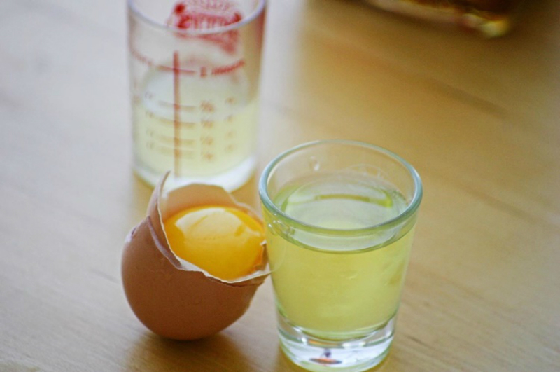 Weź jedno jajko i ubij z niego białko. Nałóż je na skórę powieki za pomocą bawełnianego wacika. Obszar znajdujący się nad okiem posmaruj do linii brwi, podobnie pod okiem. Na powiekach połóż waciki zwilżone ciepłą wodą.
