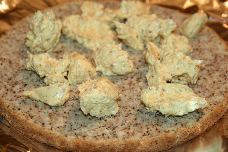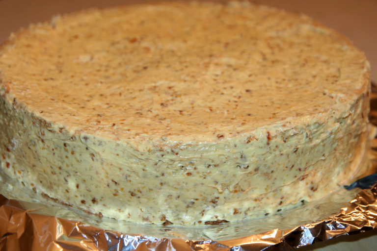 Poszczególne części tortu delikatnie smarujemy syropem i nakładamy po około 1/3 kremu. Górę i boki tortu także należy posmarować kremem. Dla dekoracji górę i boki tortu posypujemy orzechami.