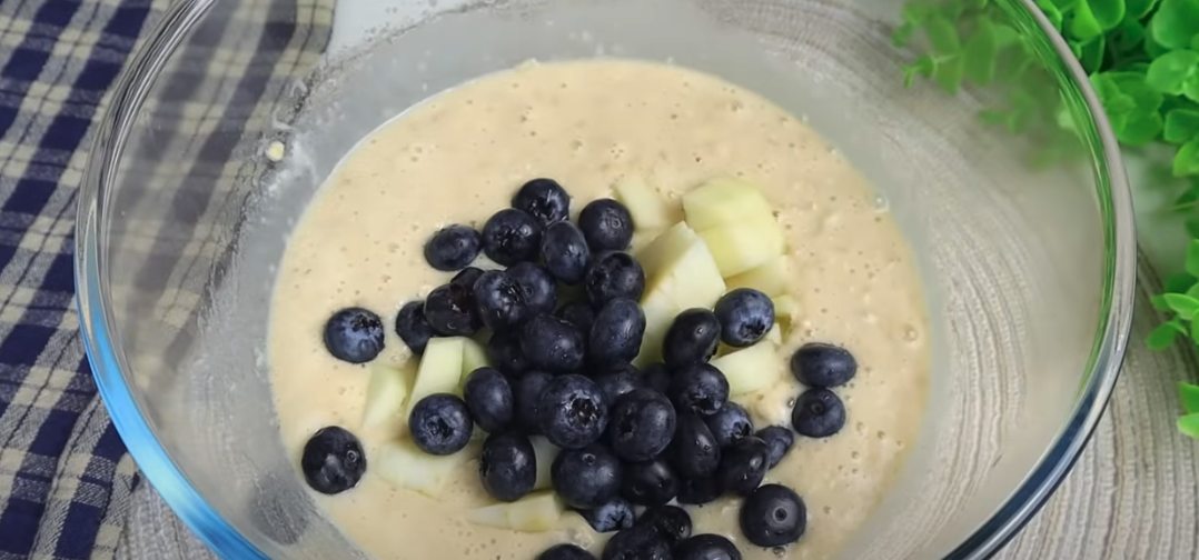 Dodaj pokrojone jabłka oraz 100g borówek do masy i delikatnie wymieszaj. Nasmaruj formę do ciasta (o średnicy 30cm) masłem lub olejem. Przełóż ciasto do formy i piecz w temperaturze 180°C przez 45-50 minut.