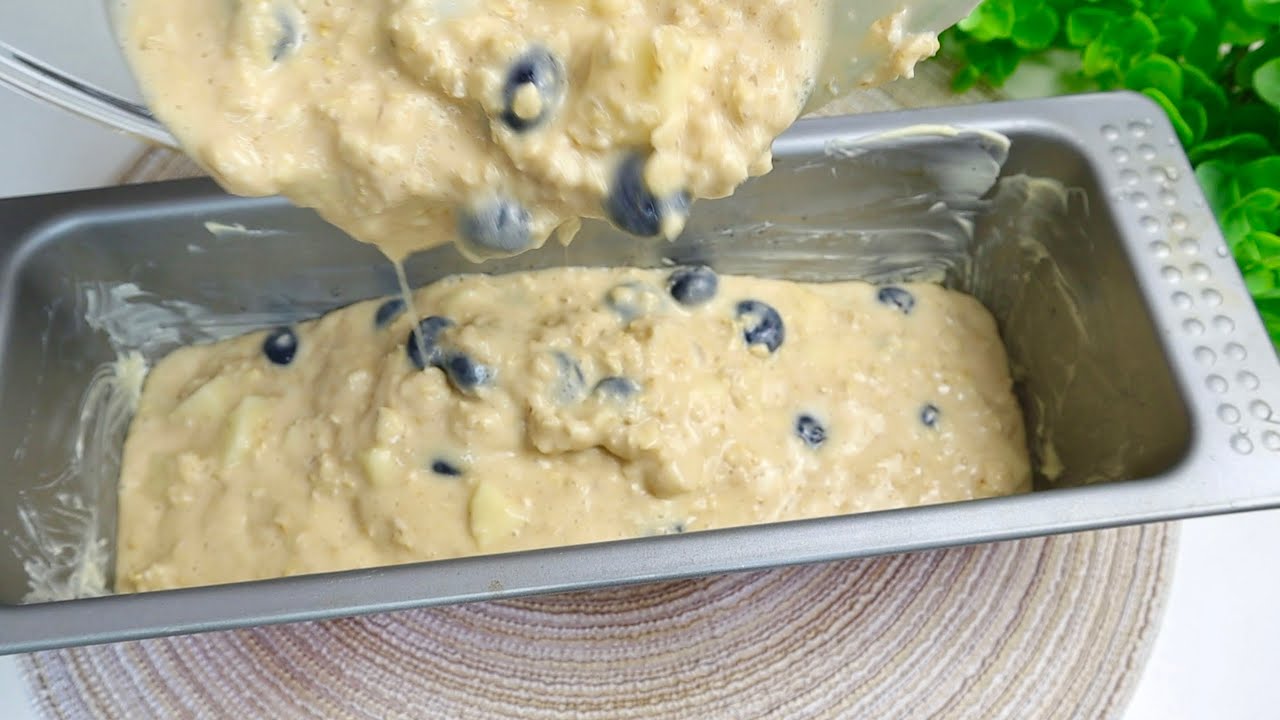 W misce wymieszaj 130g płatków owsianych z 240ml gorącej wody. Odstaw na 10 minut, aby płatki dobrze namokły. W międzyczasie obierz i pokrój jabłko na małe kawałki. W osobnej misce ubij 2 jajka. Dodaj 120g jogurtu naturalnego, 3 łyżki cukru, 1 łyżeczkę olejku waniliowego oraz 60g roztopionego masła. Dodaj namoczone płatki owsiane do masy i dobrze wymieszaj. Dodaj 1 łyżkę proszku do pieczenia i ponownie wymieszaj.
