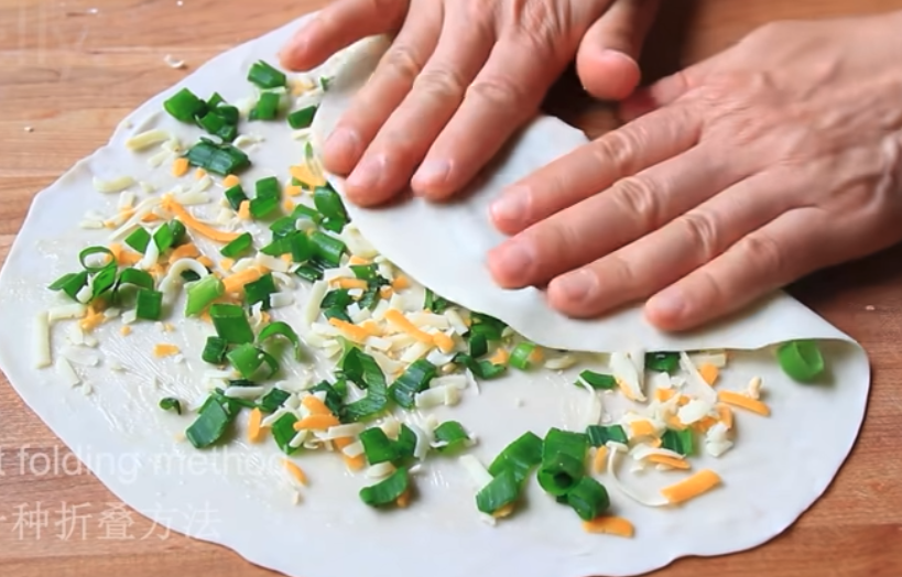 W misce wymieszaj 95 ml wody z 1,5 g soli (1/4 łyżeczki). Stopniowo dodawaj 150 g mąki (1 szklanka), mieszając, aż składniki się połączą i powstanie gładkie ciasto. Dodaj 30 g posiekanej zielonej cebuli oraz szczyptę sody oczyszczonej i ponownie wymieszaj. Dodaj 50 g startego sera do ciasta i delikatnie wymieszaj. Na stolnicy posypanej mąką (1/4 szklanki) i skrobią kukurydzianą (1/4 szklanki), wyłóż ciasto i delikatnie rozwałkuj.