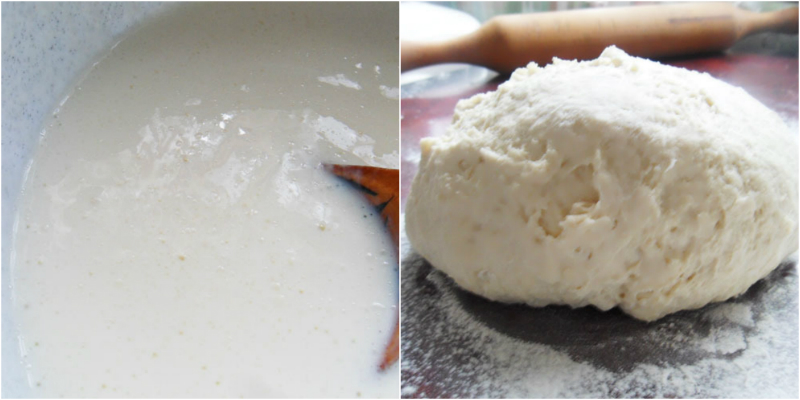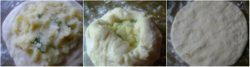 Po tym czasie ciasto wykładamy na podsypany mąką blat. Rozwałkowujemy na grubość 1-1,5 cm. Wycinamy duże koła. Na środek każdego koła nakładamy farsz, łączymy brzegi, tak by powstał okrągły placek, a farsz nie wypadał ze środka.