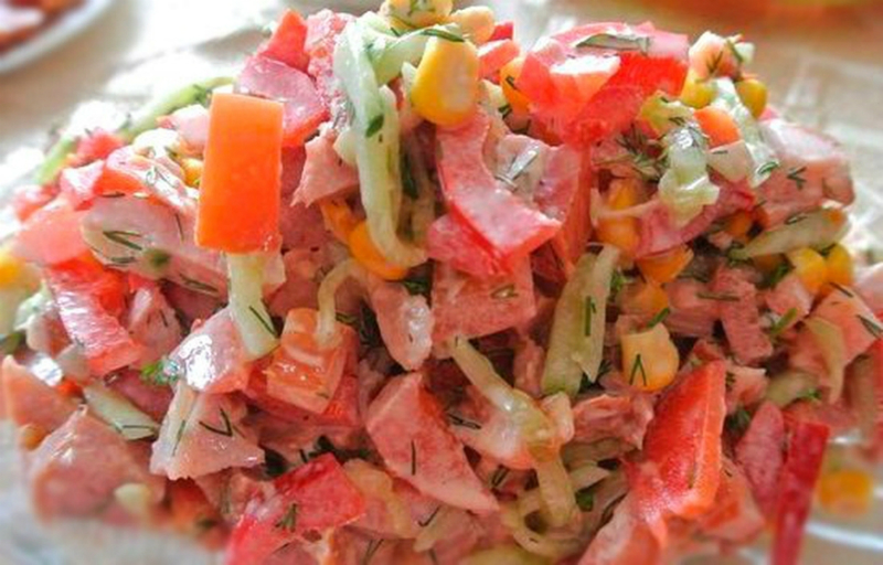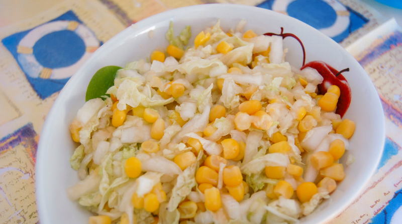 200 g młodej kapusty cienko posiekaj, 1 słodkie i kwaśne jabłko pokrój w paski lub cienkie plasterki. Dodaj 2-3 łyżki kukurydzy. Skrop sałatkę octem jabłkowym i olejem słonecznikowym, dopraw solą i wymieszaj.