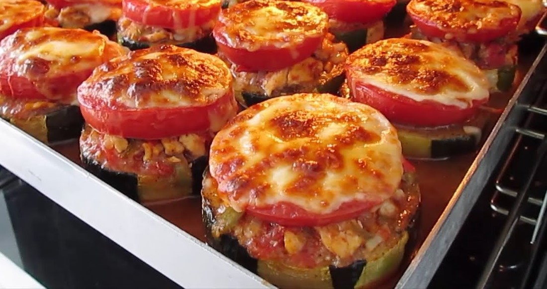 Na wierzchu ułóż po plastrze pomidora. Polej sosem przygotowanym z koncentratu pomidorowego i wody, po czym posyp je startym serem. Wstaw do nagrzanego piekarnika i piecz około 30 minut w temperaturze 200°C. Wszystko gotowe. Życzę smacznego!