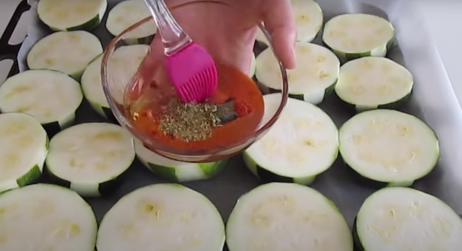 Cukinię umyj, odetnij końce, następnie obierz ze skórki co drugi pasek, pokrój w grubsze krążki i ułóż na blasze wyłożonej papierem do pieczenia. Przygotuj mieszankę z oleju i przypraw, wymieszaj i nasmaruj nim każde warzywne koło. Wstaw do nagrzanego piekarnika i piecz w temperaturze 180°C przez 30 minut.