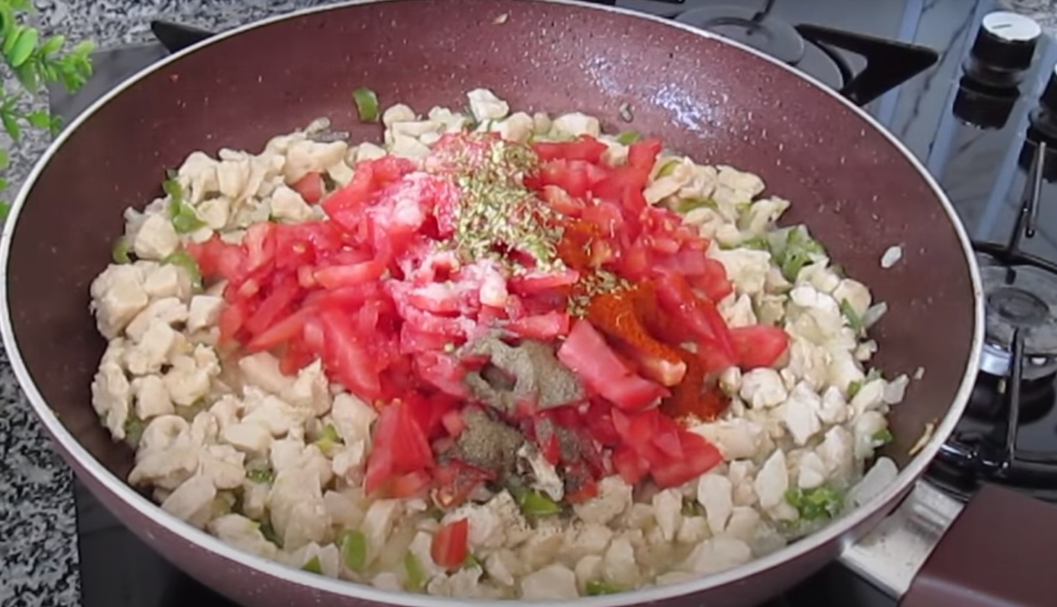 Wlej trochę oleju roślinnego na patelnię, podsmaż cebulę i dodaj pokrojoną w plasterki paprykę. Dodaj też kurczaka i smaż przez chwilę, od czasu do czasu mieszając. Następnie dodaj pokrojone pomidory, sól, przyprawy i wymieszaj. Podsmaż i zdejmij z ognia.