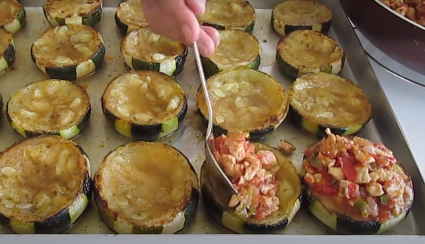 Delikatnie dociśnij po środku łyżką upieczone kółka z cukinii, aby utworzyć wgłębienie, ułóż w nim przygotowane nadzienie.
