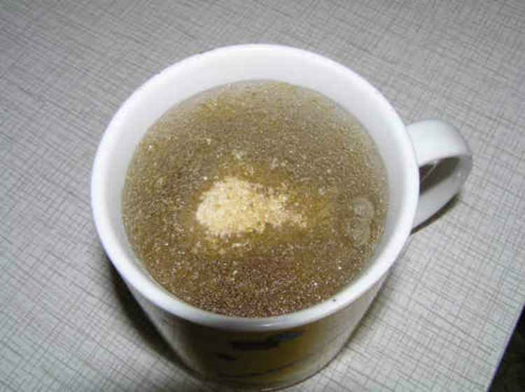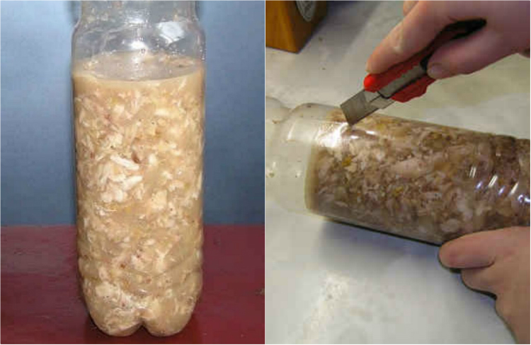 Całość (bulion z mięsem, żelatyną, orzechami, przyprawami i czosnkiem) przelej do wyczyszczonej, plastikowej butelki, z uprzednio odciętą szyjką, a następnie włóż do lodówki, w której danie powinno poczekać kilka godzin do całkowitego stężenia.