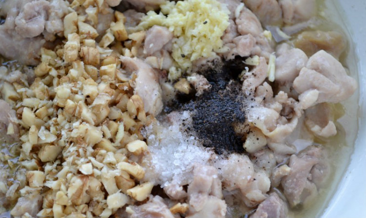 Pozostaw do ostygnięcia. Odcedzony bulion wymieszaj z żelatyną, do gotowej mieszanki wrzuć orzechy i przeciśnięty przez praskę czosnek.
