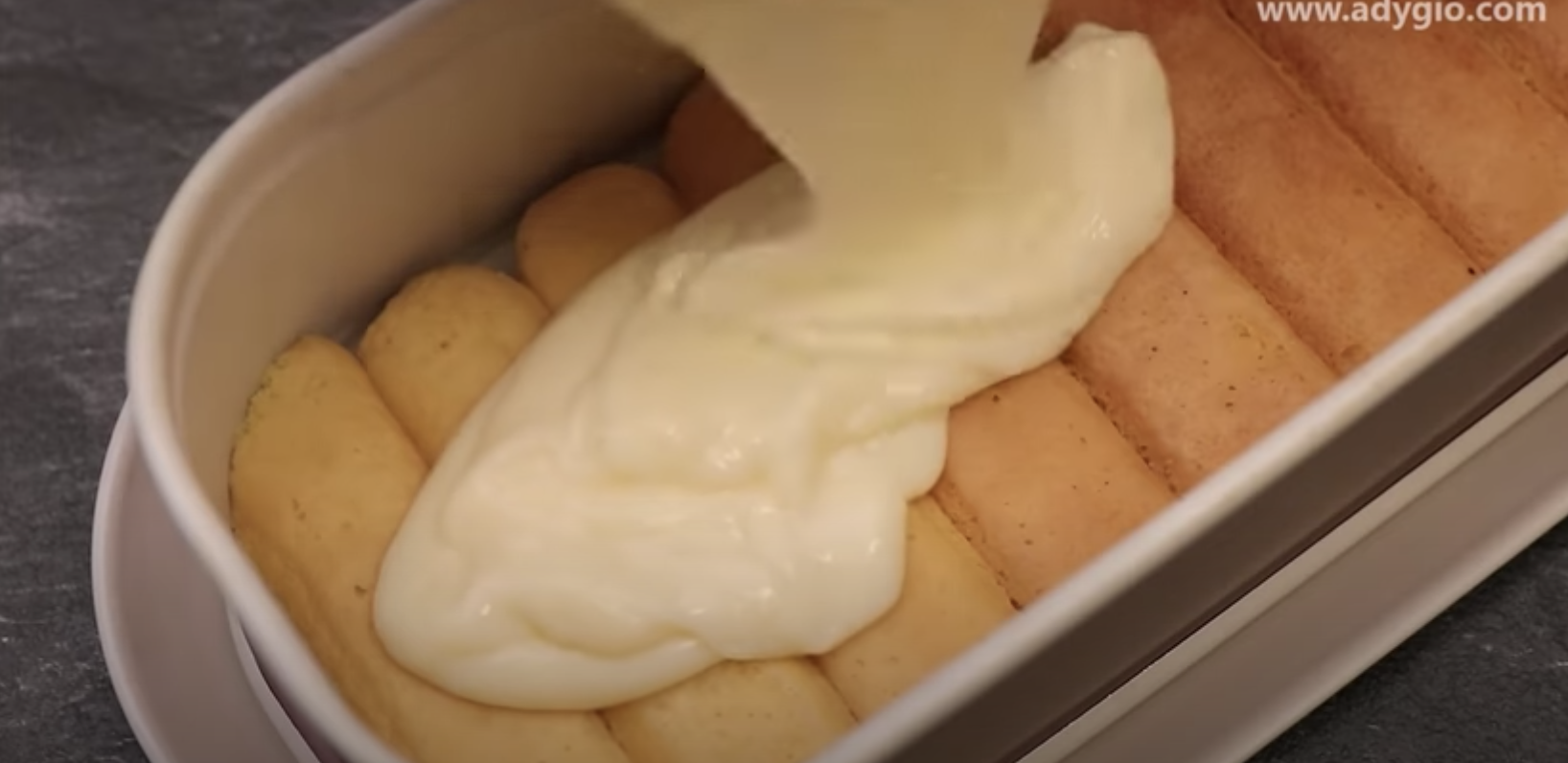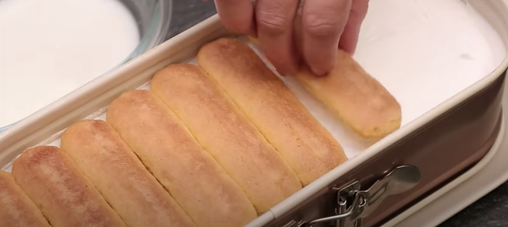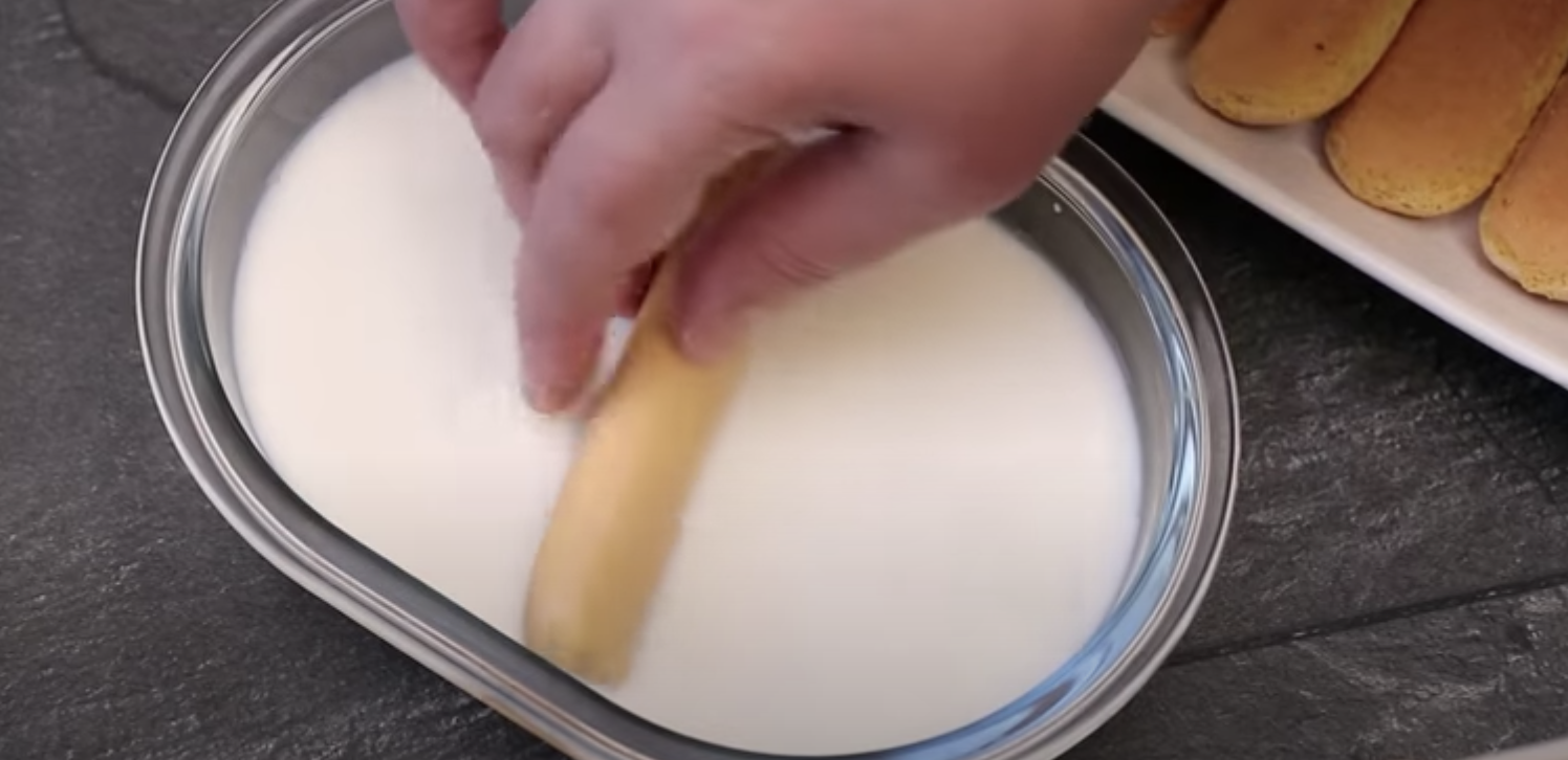 W małej foremce (np. takiej, w której zmieści się jeden rząd biszkoptów) układaj biszkopty zamoczone chwilę wcześniej w mleku.