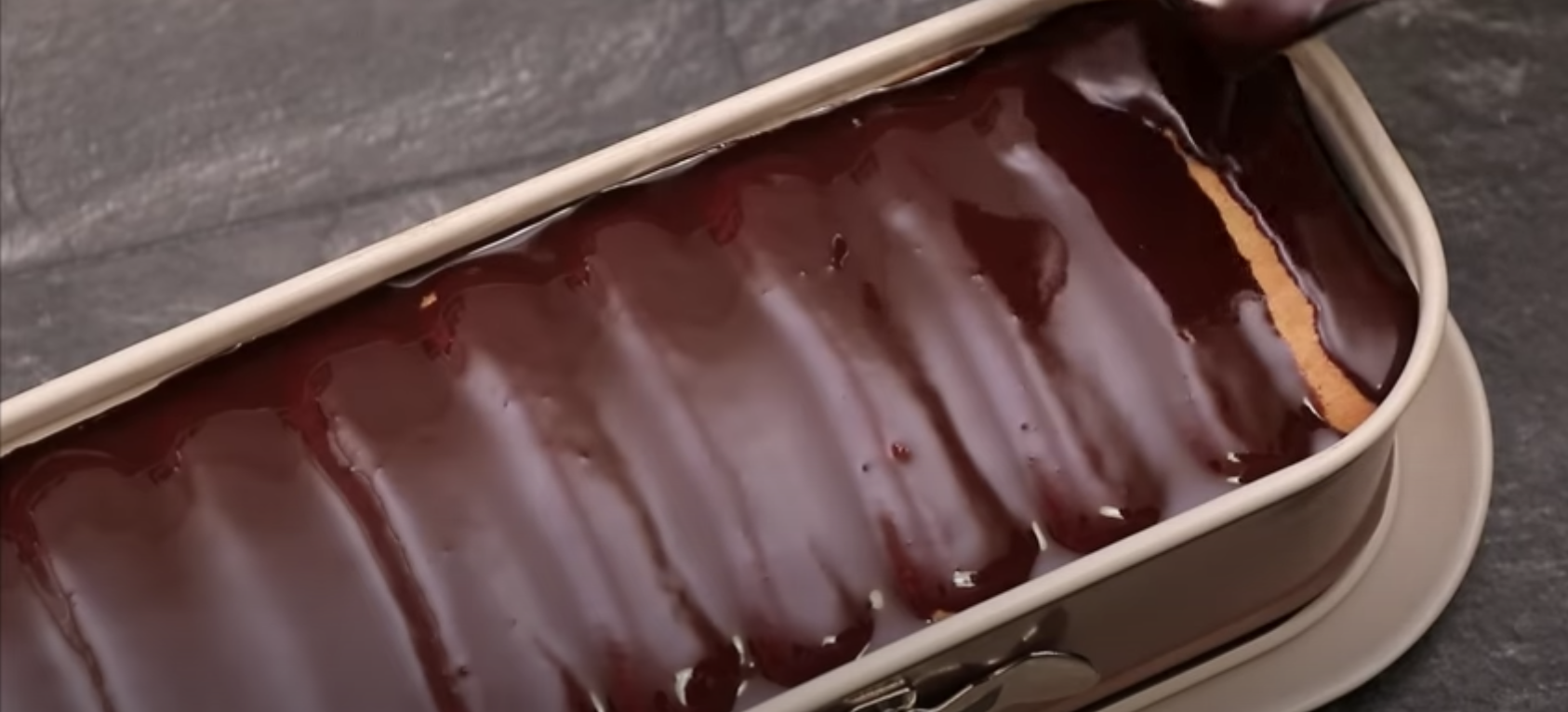 Połam czekoladę na kawałki, rozpuść ją w podgrzanej śmietanie. Polej wierzch ciasta i poczekaj aż ostygnie.
