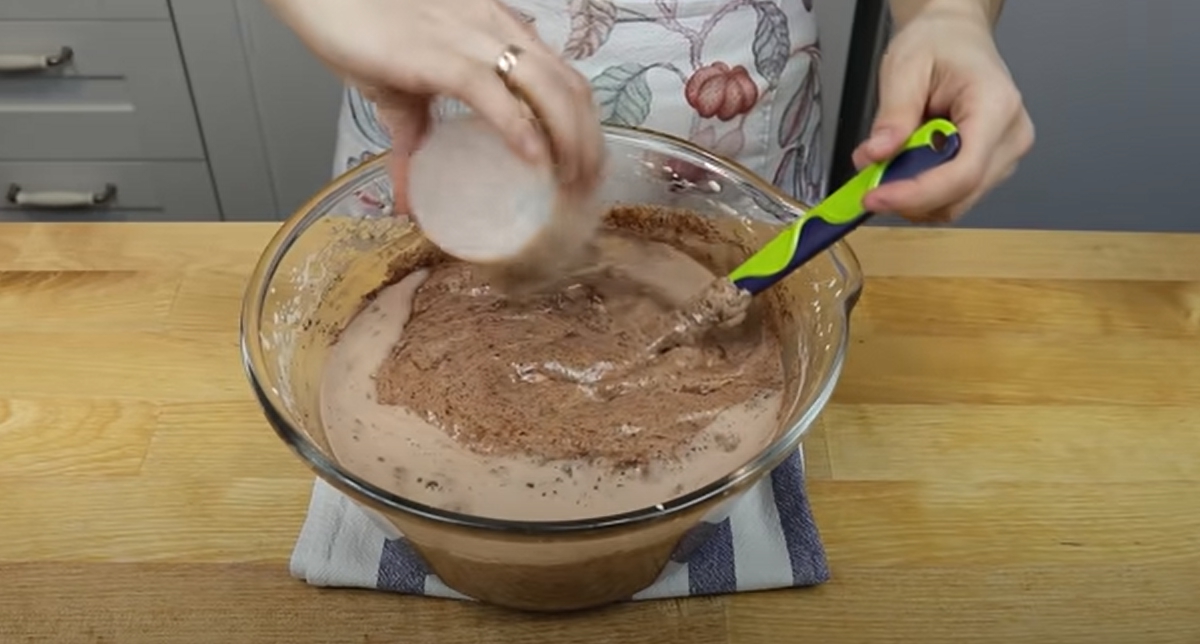 Osobno wymieszaj mąkę z proszkiem do pieczenia i kakao. Nastąpienie przesiej powstałam mieszankę przez sitko i dodaj małymi etapami do miski z ubitym mi białkami. Całość lekko wymieszaj całość od dołu do góry.