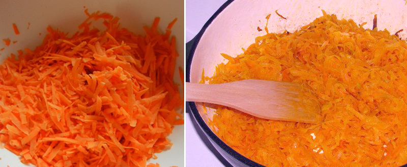 Obierz marchewki, umyj, a następnie zetrzyj na tarce o grubych oczkach. Na patelni rozgrzej masło, a następnie wrzuć startą wcześniej marchewkę. Smaż przez ok. 5 minut, aż stanie się ona miękka, a potem zostaw do ostygnięcia.