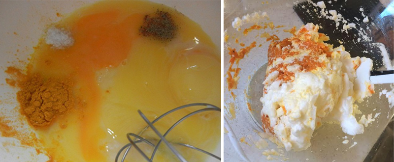 Oddziel żółtka od białek. Białka ubij ze szczyptą soli oraz sokiem z cytryny do utrzymania sztywnej piany. Żółtka ubij z kurkumą, solą oraz innymi przyprawami. Delikatnie i powoli dodaj zmieszane białko i żółtko do ciasta, a całość wymieszaj. Na tym etapie przygotowań ciasto powinno być lekkie oraz puszyste.