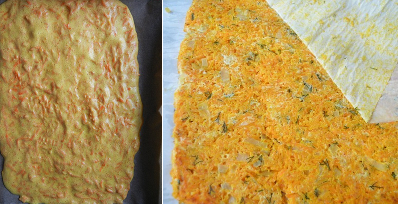Upieczone ciasto wyjmij z blachy i umieść je na folii spożywczej tak, aby pergamin znajdował się na górze. Delikatnie i ostrożnie zdejmij papier tak, aby nie pokruszyć ciasta. Równomiernie rozprowadź przygotowane nadzienie na cieście, a następnie za pomocą folii zwiń w rulon.