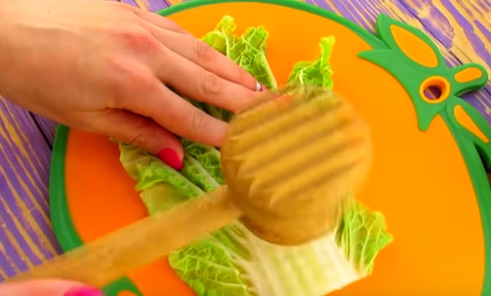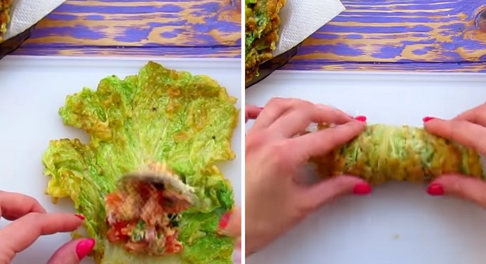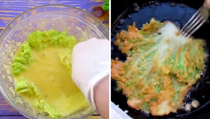 Liście kapusty maczać kolejno w przygotowanym cieście i smażyć na głębokim oleju przez kilkanaście sekund po obu stronach. Następnie przenieść na ręcznik papierowy, aby pozbyć się nadmiaru tłuszczu.