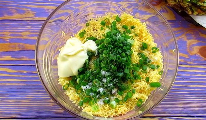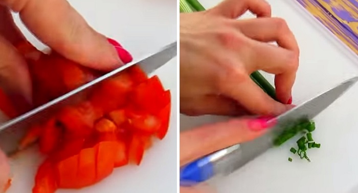 Przygotować nadzienie. Pomidory i szynkę pokroić w dość dobrną kostkę. Ser zetrzeć na tarce o grubych oczkach, a szczypiorek drobno posiekać.