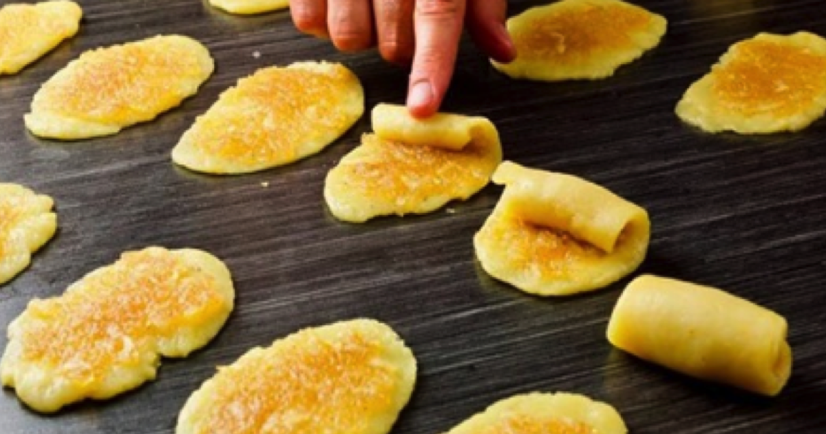 Powoli wsypuj mąkę do masy, a potem zagnieć ciasto. Biorąc kawałek ciasta, zrób kulkę i rozwałkuj ją, połóż nadzienie, a następnie wyrównaj kulkę i zrób z niej rulon.