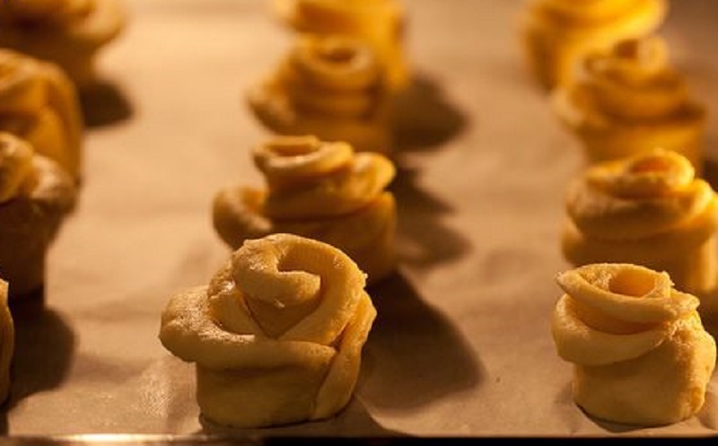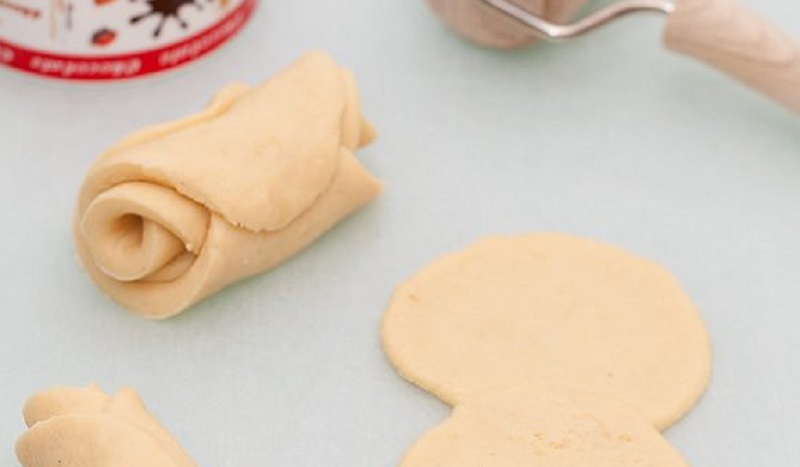 Jeśli źle będzie ono odchodziło od ręki – należy podsypać trochę mąką i ponownie energicznie wyrobić ciasto. Rozwałkować je na grubość około 3 mm i wycinać kółka używając do tego szklanki. Kółeczka kłaść na siebie i zwinąć je w rulonik.