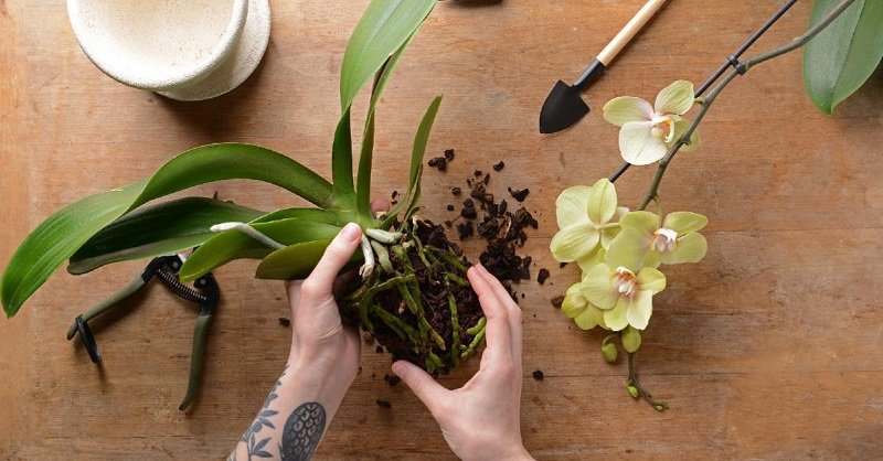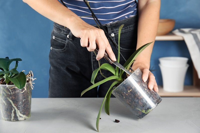 Po ostrożnym wyjęciu storczyka z doniczki należy obejrzeć jego korzenie. Zniszczone fragmenty powinno się przyciąć, a miejsca po cięciu przemyć nadmanganianem potasu, lub też pokruszonym węglem drzewnym.