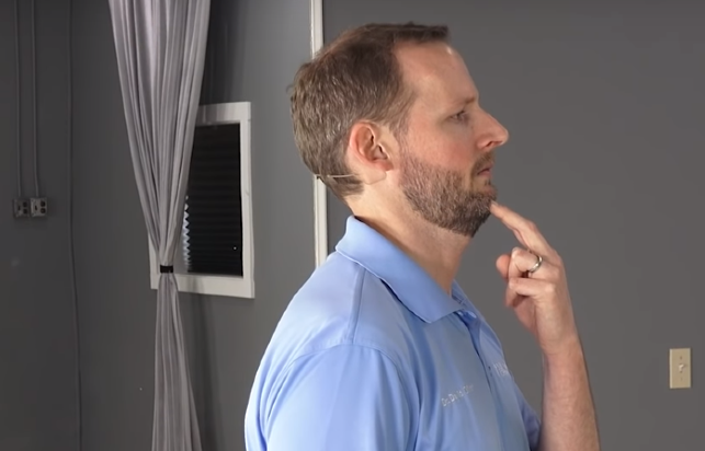 Stań prosto. Oprzyj palec wskazujący i środkowy na podbródku i delikatnie cofnij głowę. Pamiętaj aby podczas ćwiczenia czuć się komfortowo. Jeśli pojawi się ból zmniejsz odchylenie głowy. Ćwiczenie możesz wykonać na dwa sposoby. Podaną sekwencję ruchów powtórz 10-15 razy lub pozostań w pozycji tylnej przez około 10 sekund (powtórz 5 razy).