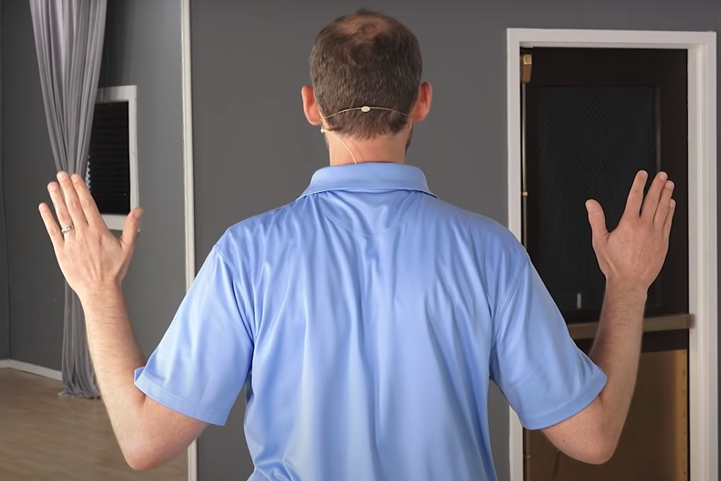 Stań prosto. Ręce ustaw w pozycji „W”. Wykonaj ruch polegający na jednoczesnym pchnięciu łokci w dół i do tyłu. Pamiętaj aby ramiona ciągnąć w dół, nie wypychać ich w górę oraz nie wyciągać głowy do przodu (powinna ona pozostawać w takiej pozycji jak w ćwiczeniu nr 1). W takiej pozycji powinieneś poczuć skurcz w placach. Pozostań w tej pozycji przez około 5 sekund. Ćwiczenie potwórz 5 razy.