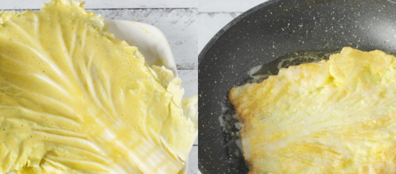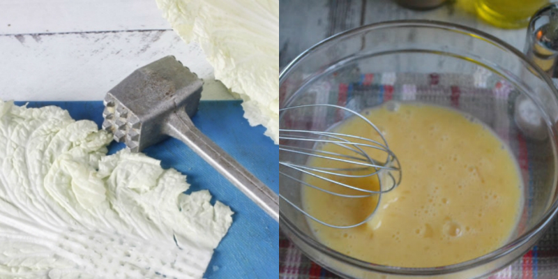 Jaja mieszamy z solą i pieprzem. Następnie dodajemy mąkę i mieszamy aż do uzyskania gładkiej masy. Odcinamy liście od łodygi i je rozbijamy tłuczkiem. Tak przygotowane liście zanurzamy w masie i smażymy na oleju po obu stronach. Gotowe kładziemy na papierowy ręcznik, który wchłonie nadmiar tłuszczu.