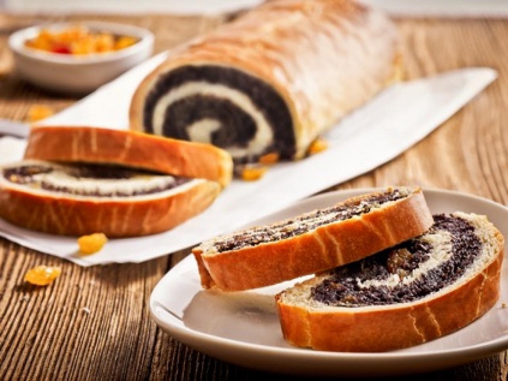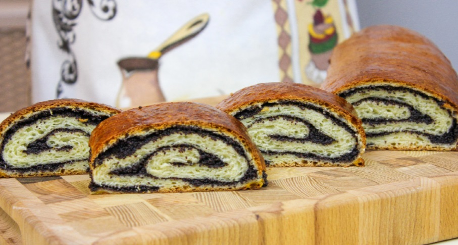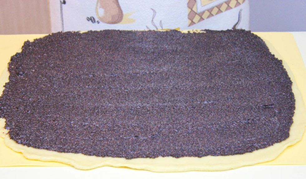 Do garnka wlać mleko z cukrem, wsypać cukier waniliowy, skórkę z cytryny oraz zmielony mak. Gotować przez kilka minut i odstawić do wystygnięcia. Przygotowany wcześniej zakwas wykładamy na posypany mąką blat i rozdzielamy na 4 części. Każdą wałkujemy na kształt prostokąta na grubość ok. 3 mm.