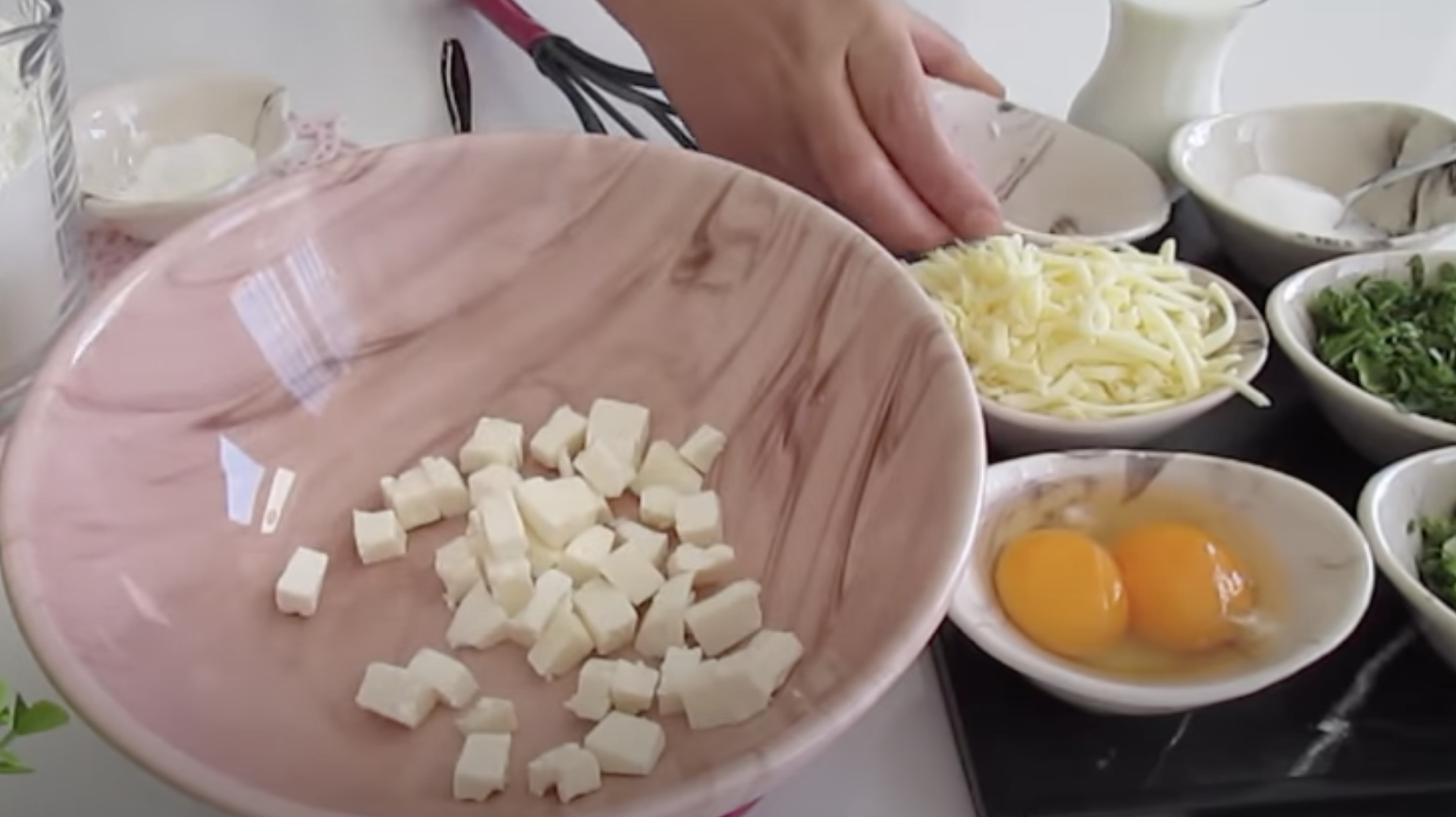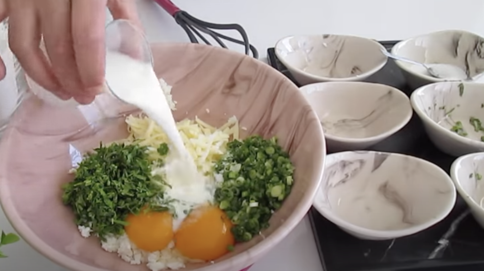 W misce wymieszaj pokruszony ser bałkański, starty twardy ser, jajka, mleko i posiekane zielone zioła.