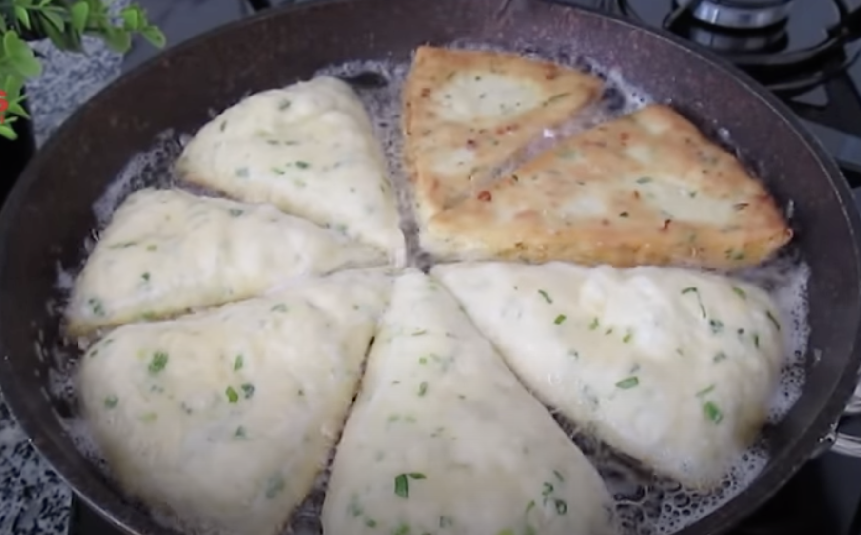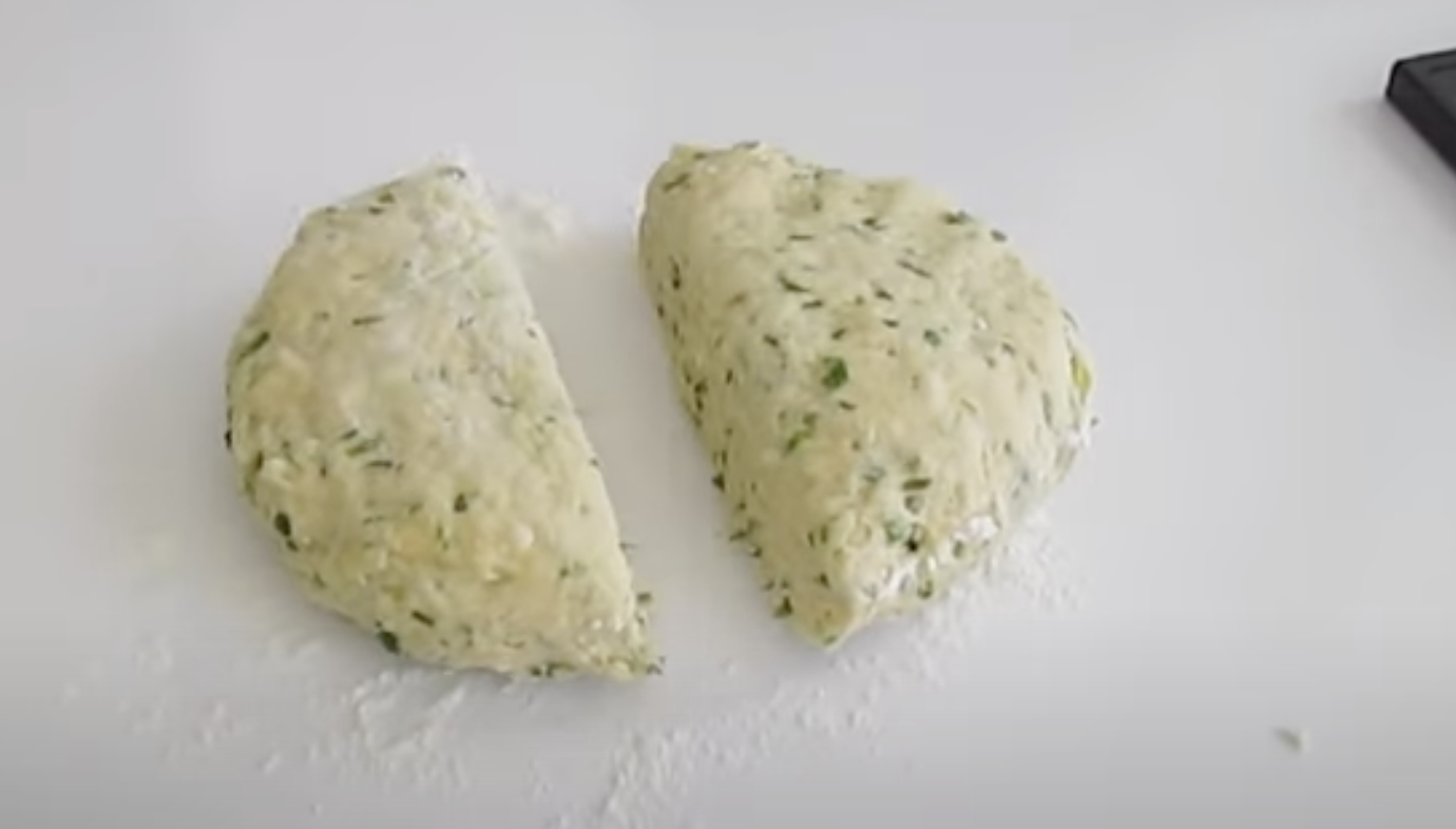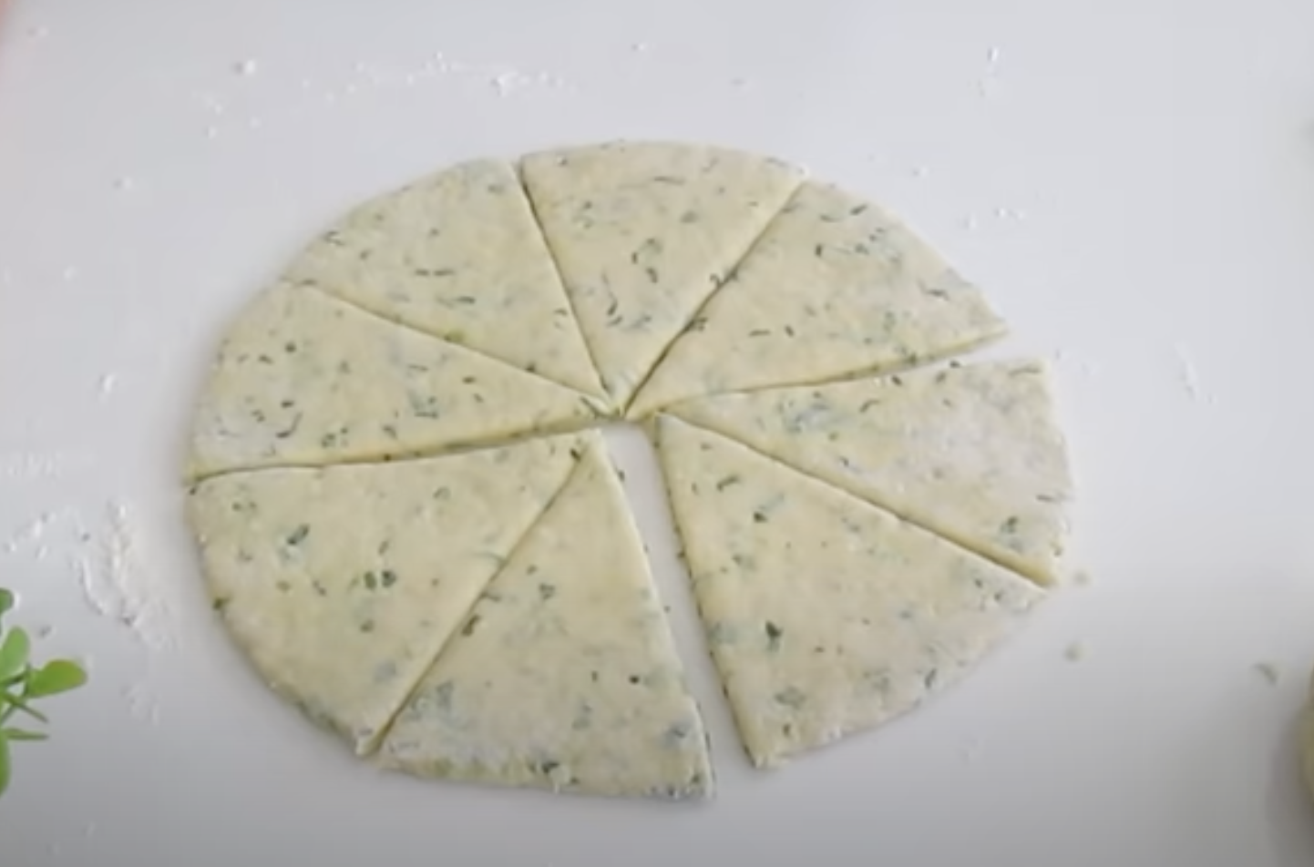 Rozwałkuj na posypanej mąką desce w kształt koła i pokrój w trójkąty.