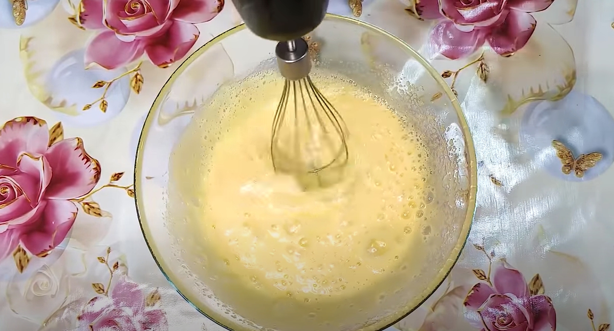 Na początek ubij jajka z cukrem. Następnie dodaj do tego roztopione masło i wlej mleko.