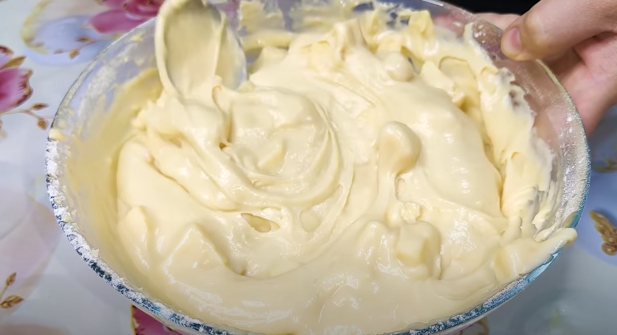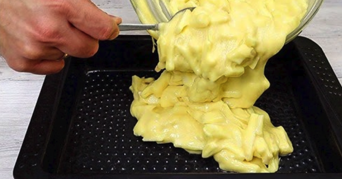 Następnie dodaj je do ciasta i wymieszaj. Przygotuj blachę i posmaruj niewielką ilością masła. Wlej do niej utworzoną masę.