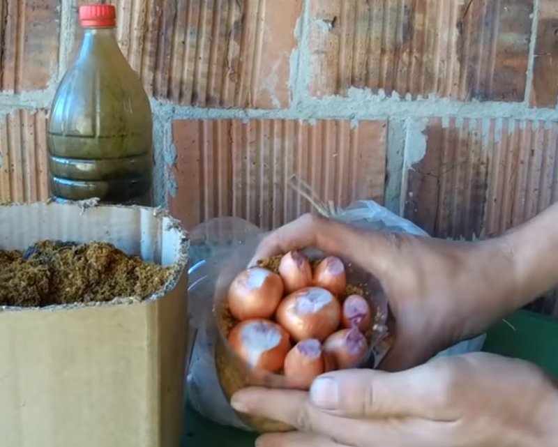Dno butelki wyłóż papierem toaletowym, szmatami, trocinami lub czymś innym, co posiadasz a co pomoże Ci utrzymać wilgoć przez długi czas. Wybierz 5 – 7 cebul, wielkości mniej więcej kurzego jaja. Odetnij czubek każdej cebuli, aby widoczny był jej środek. Ułóż cebulki na wyściółce.