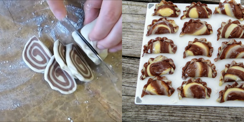 Aby Twoje pierogi nabrały paskowanego wzoru, wystarczy że przy wyrabianiu ciasta podzielisz je na połowę i dodasz do jednej z części kakao.