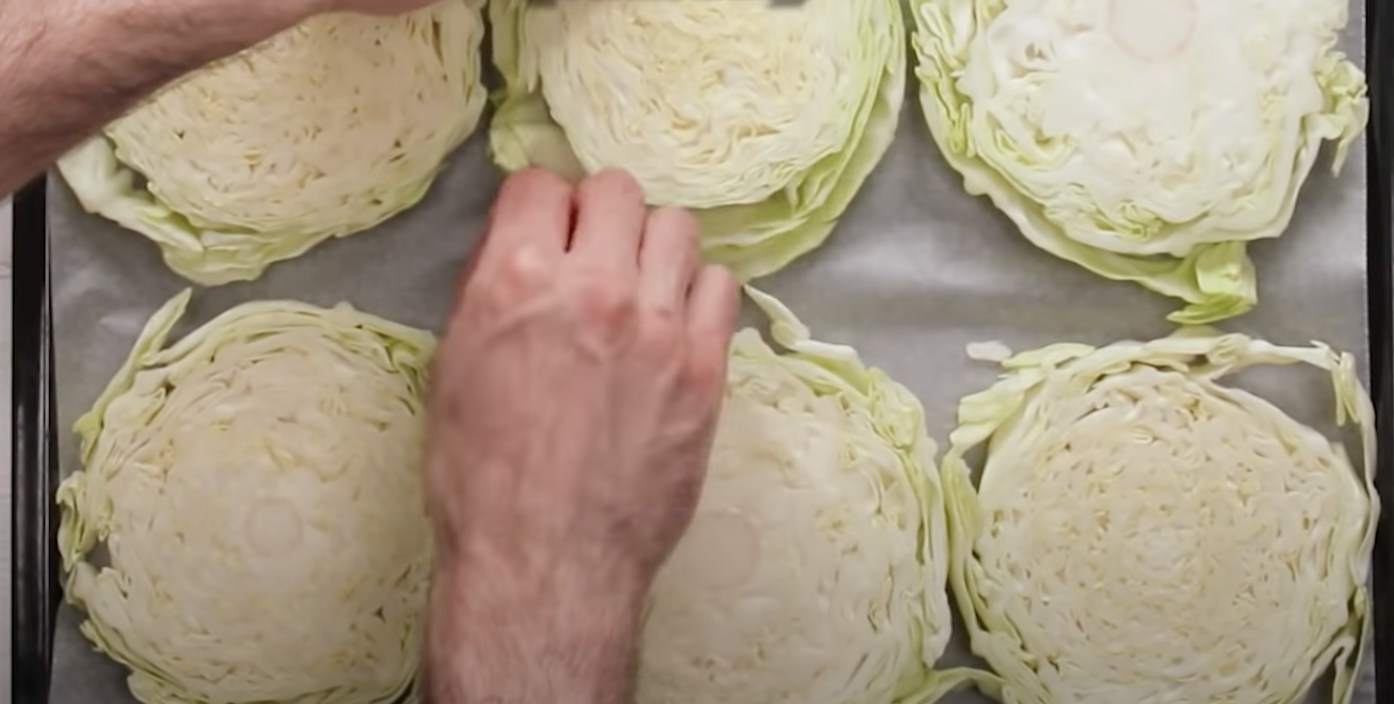 Blachę wyłóż papierem do pieczenia i poukładaj na niej skrojoną kapustę.