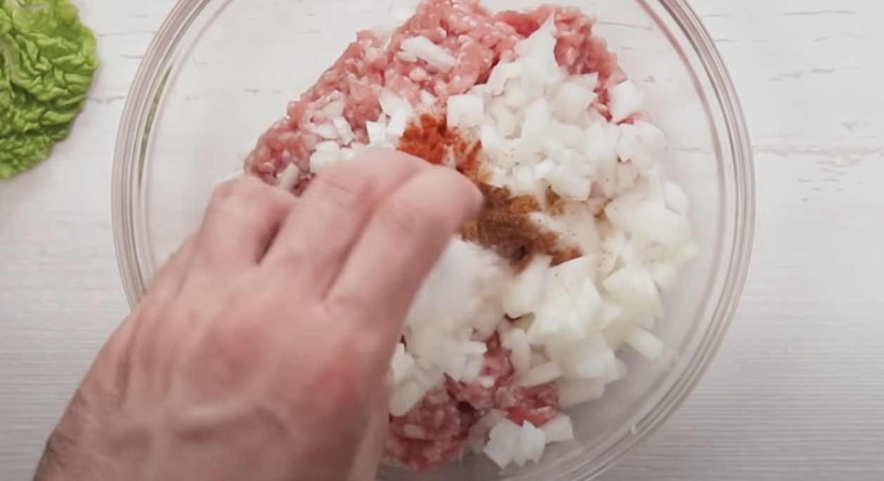 Przygotuj składniki potrzebne do farszu. Mięso mielone dokładnie wymieszaj z drobno posiekaną cebulą, dopraw do smaku solą i pozostałymi przyprawami.