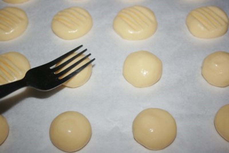 Kuleczki układamy na papierze w odstępach. Następnie każdą kuleczkę naciskamy widelcem tworząc na ciasteczkach charakterystyczny wzorek.