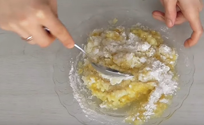 Wsyp cukier i łyżkę mąki do cytryny i wymieszaj. Aby zrobić ciasto, zetrzyj zimne masło z mąką, tak aby utworzyły się okruchy.