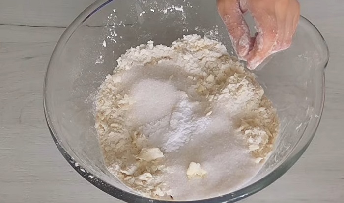 Następnie Odłóż dwie łyżki okruchów, aby potem posypać nimi ciasto. Teraz dodaj cukier, wsyp proszek do pieczenia i sól.