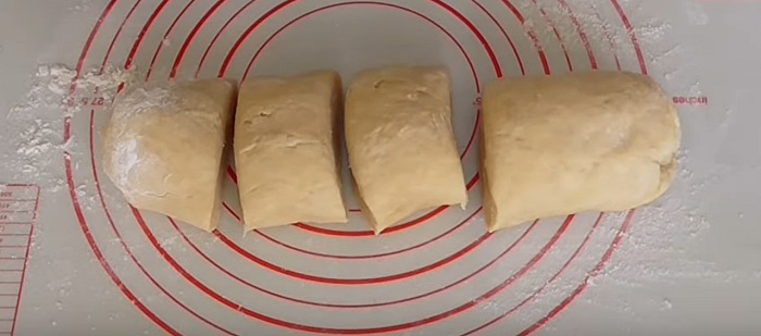 Z tak otrzymanego ciasta zrób rulon i podziel go na cztery części. Postaraj się zrobić to w taki sposób, żeby jedna z części była trochę większa od pozostałych.