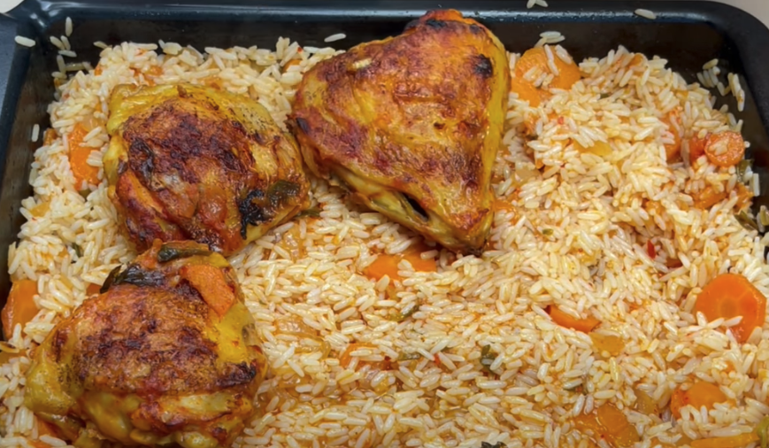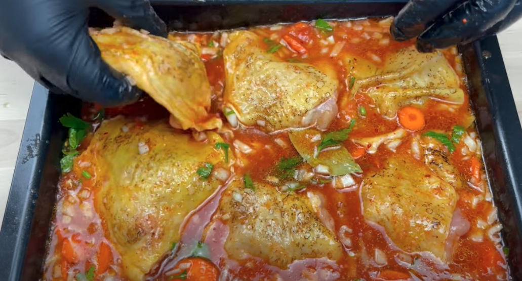 Wlej 300 ml wody i dobrze wymieszaj. Dodaj udka kurczaka do naczynia z warzywami i marynatą, dobrze obtocz kurczaka w marynacie. Piecz udka kurczaka w piekarniku nagrzanym do 200°C przez 40 minut. W tym czasie ugotuj 400 g ryżu długoziarnistego według instrukcji na opakowaniu. Po 40 minutach pieczenia, wyjmij kurczaka z piekarnika, obróć udka i piecz przez kolejne 12 minut w temperaturze 200°C, aż kurczak będzie zarumieniony, a sos zgęstnieje.