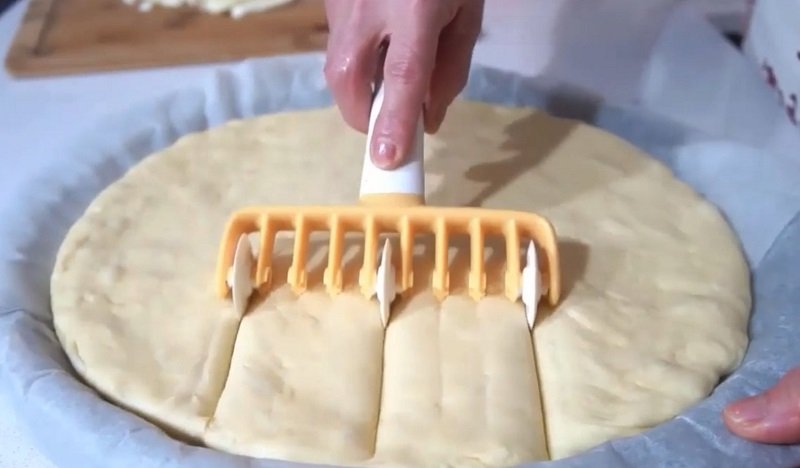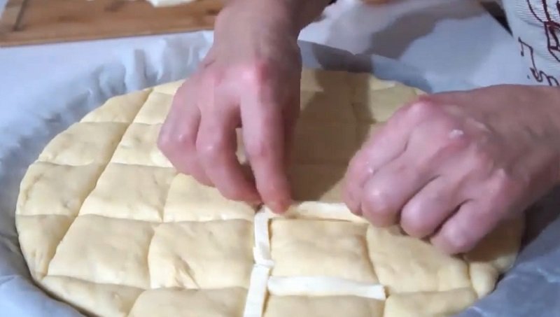 Na cieście zrób nacięcia przy pomocy noża tak samo jak na zdjęciu poniżej. Na nacięciach układaj paski mozzarelli. Ponownie przykryj ciasto folią albo ściereczką i odstaw w ciepłe miejsce, aż urośnie.