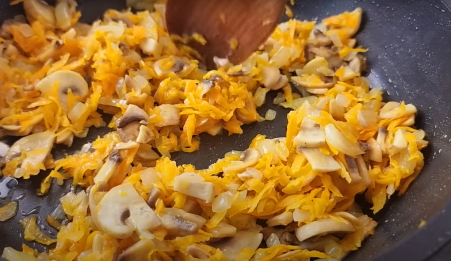 Teraz pora na warzywa. Zacząć od cebuli: obrać ją i pokroić w drobniutką kostkę. Następnie marchewka – także należy ją obrać, po czym zetrzeć na tarce o grubych oczkach. Przechodząc do pieczarek, trzeba je umyć, a następnie pokroić w kostkę. Cebulę wrzucić na patelnię na olej i podsmażyć, po czym dodać marchewkę i pieczarki, dusić razem całość.