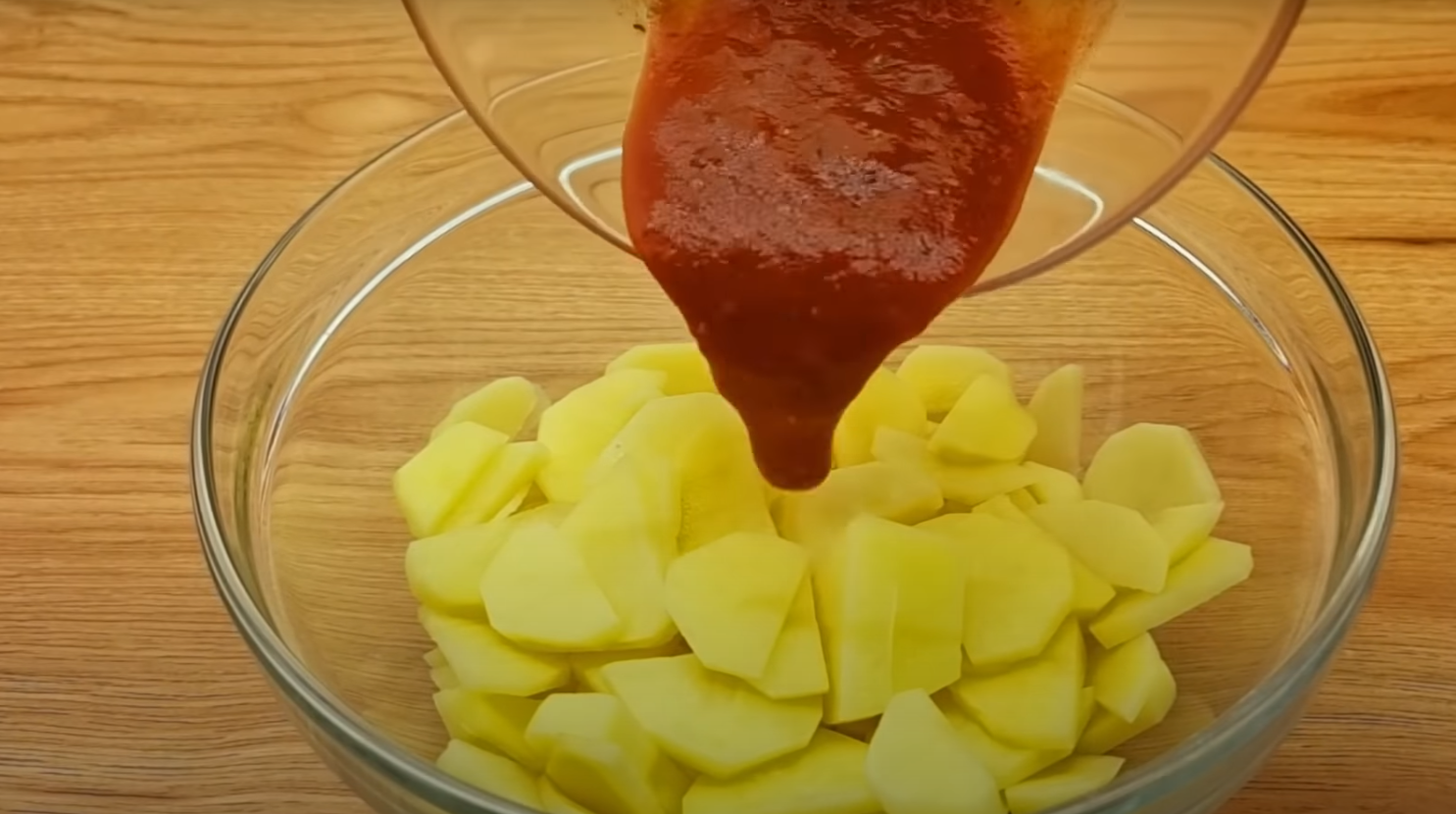 Następuje przejście do ziemniaków – trzeba je umyć i pokroić na mniejsze części. W misce umieścić łyżkę koncentratu pomidorowego, dodać jeden ząbek czosnku wyciśnięty przez praskę, wodę, sól, przyprawy i zioła, całość wymieszać, by utworzyła smaczny sos.