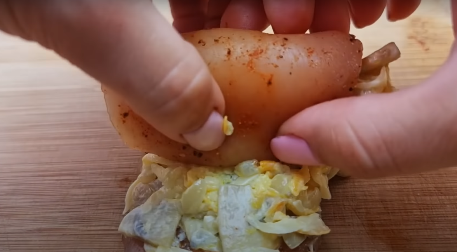 Ser zetrzeć na tarce i podzielić na dwie części. Jedną z nich dodać do warzyw na patelnię, dodać również śmietanę, sól i ząbek czosnku przeciśnięty przez praskę. Wymieszać, po czym mieszankę tę nałożyć na każdy kawałek kurczaka. Zwinąć je w roladki.