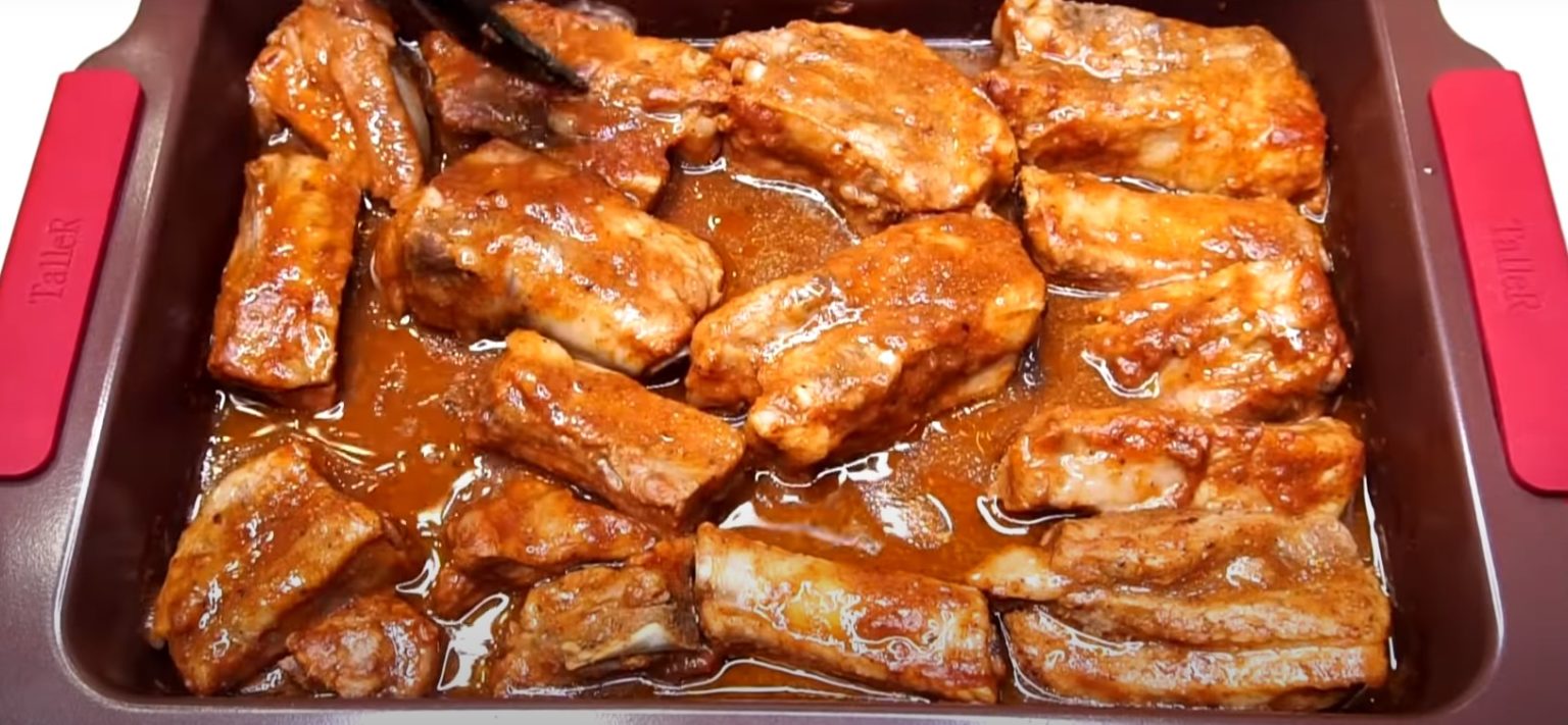 Do dużej miski przełóż umyte i osuszone żeberka, zalej przygotowaną wcześniej marynatą. Pozostaw mięso w marynacie na około 30 minut.