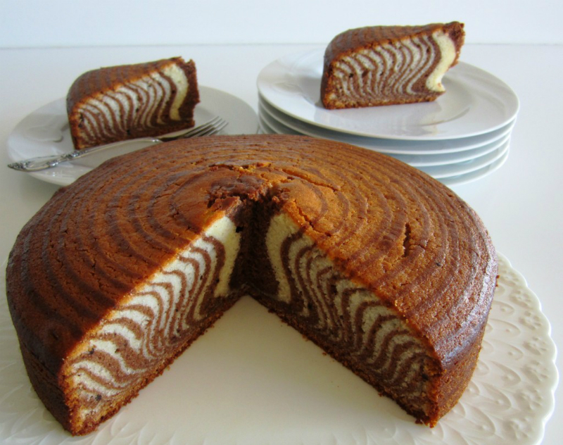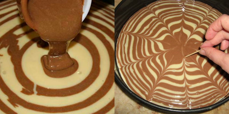 Blachę do pieczenia smarujemy olejem słonecznikowym. Na tak przygotowane naczynie wlewamy na zmianę ciemne i jasne ciasto. Formujemy je w taki sposób, aby uzyskać kształt zebry lub wykałaczką układamy wzór pajęczyny.