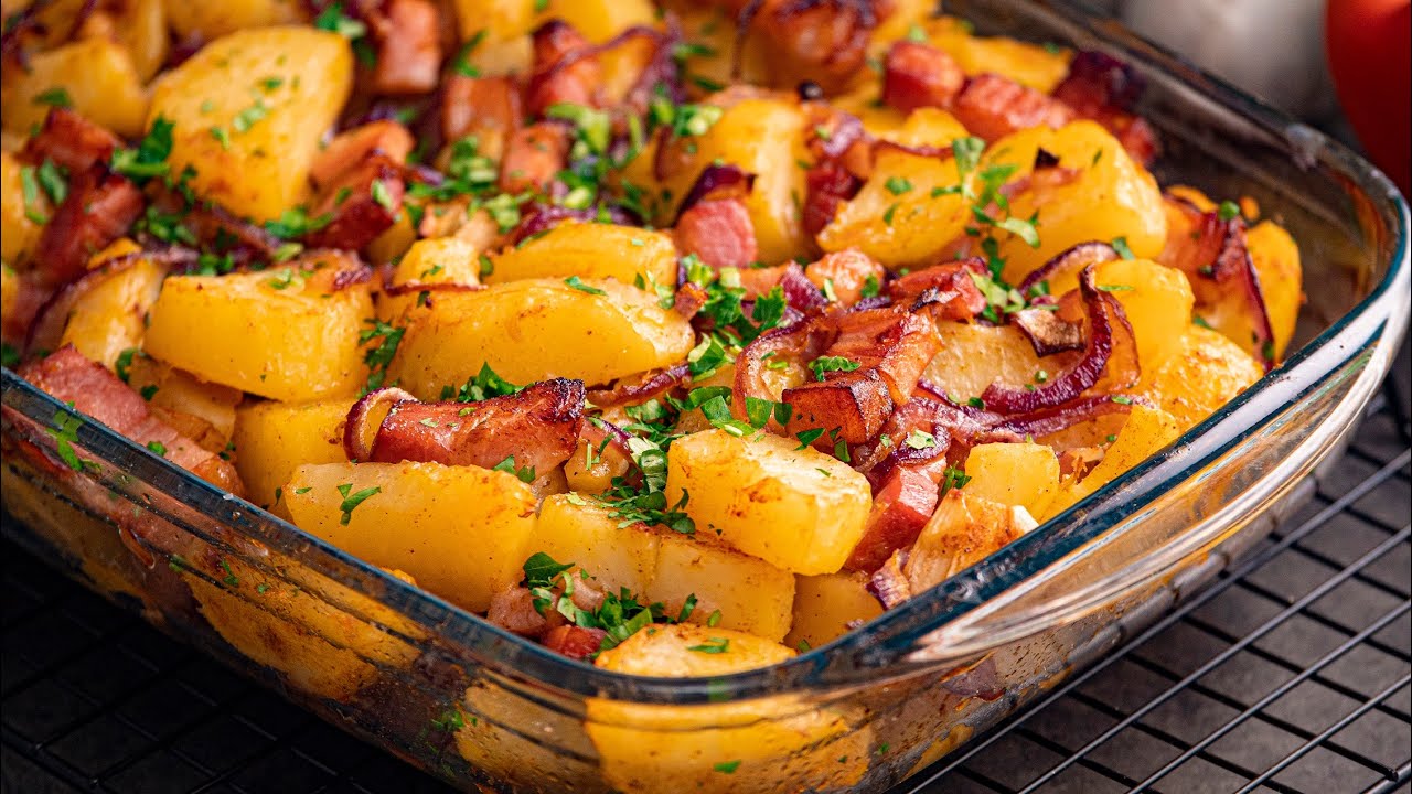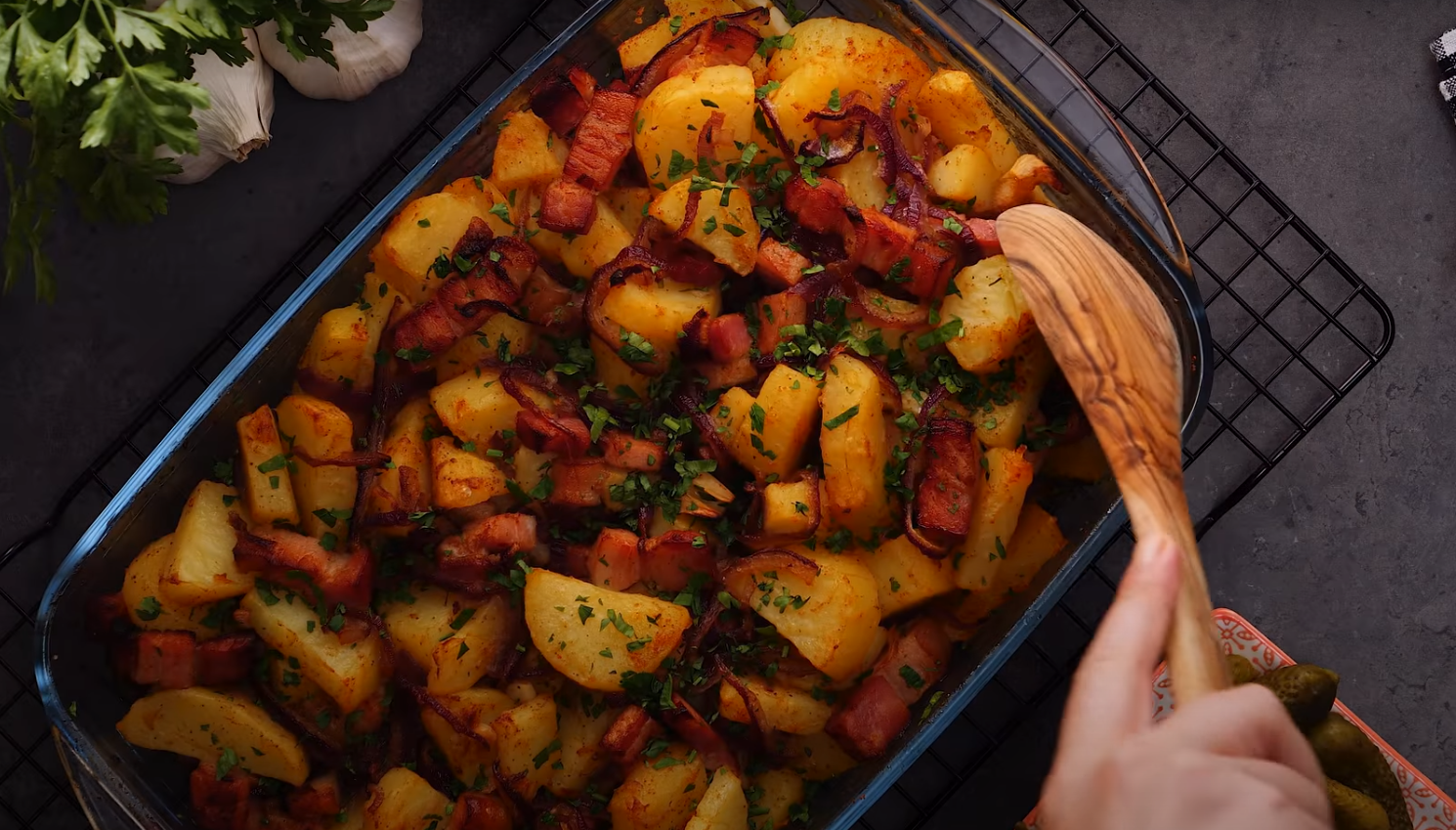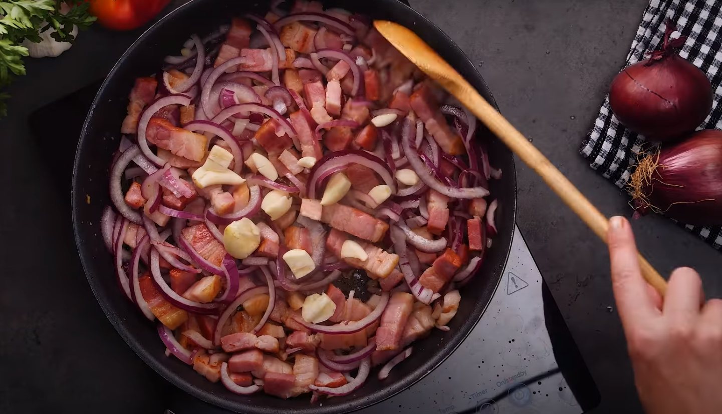 Posól oraz wymieszaj, oraz smaż razem przez kilka minut. Dodaj pokrojony czosnek i ponownie wymieszaj. Ugotowane ziemniaki przełóż do naczynia żaroodpornego, następnie dopraw solą oraz pieprzem. Dodaj boczek i cebulę oraz wymieszaj wszystko razem.